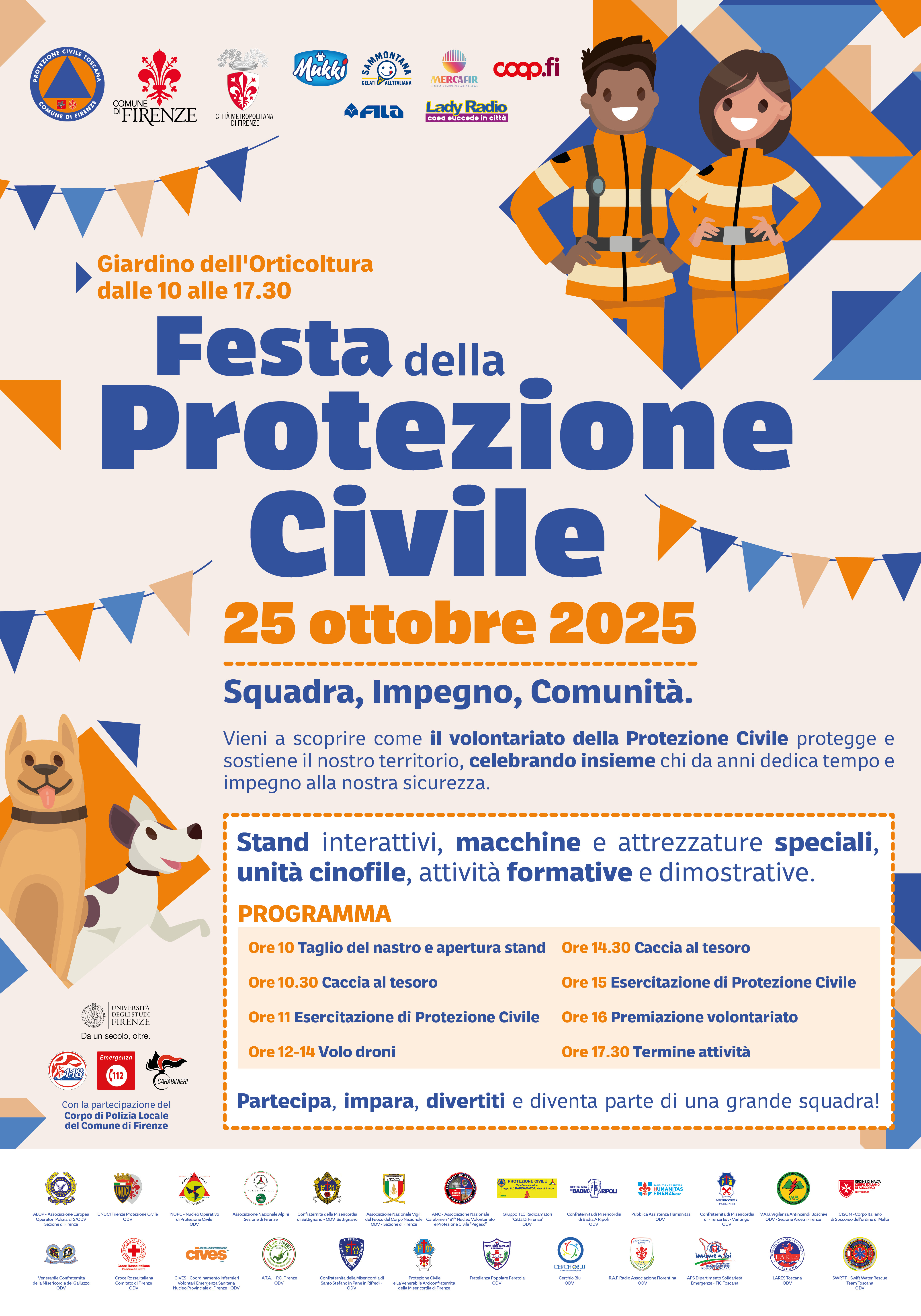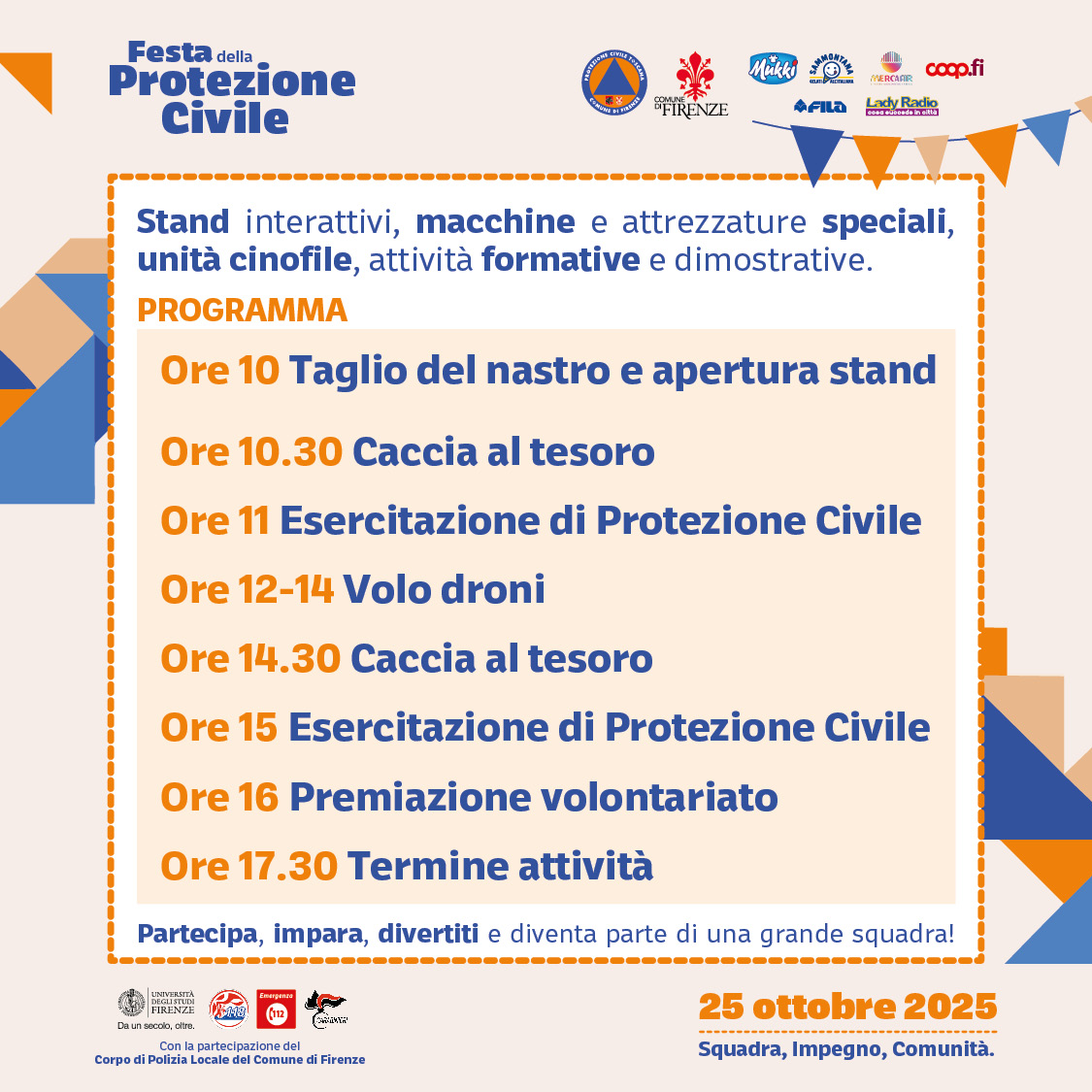 Si inizia alle 10 con il taglio del nastro e il saluto delle autorità, a cui seguiranno attività, laboratori, dimostrazioni tecniche e giochi pensati per coinvolgere bambini, giovani, adulti alla scoperta del mondo della protezione civile e per conoscere il lavoro di chi da anni dedica tempo ed impegno alla nostra sicurezza.